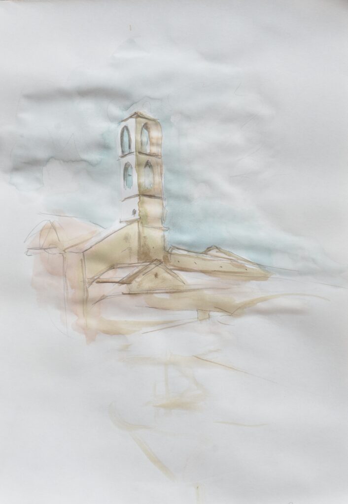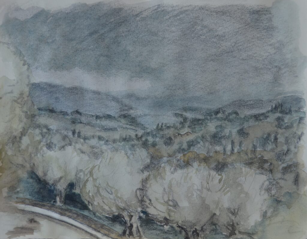 Im September 2023 verbrachte ich einige Wochen in Perugia (Umbrien). Es entstand eine intensive Mal- und Zeichenarbeit, in der ich mich einerseits intensiv mit mir selbst und schwierigen Aspekten meines Lebens auseinandersetzte und andererseits Halt in der wunderschönen Umgebung und den mich umgebenden Menschen fand. Es entstanden eine Reihe von Zeichnungen und Malereien, die für mich ‚doppelt‘ lesbar sind, weil reale Sinneseindrücke zu Symbolen für innere Erlebnisse werden bzw. unsichtbare, innere Erlebnisse sich in Abbildern des Sichtbaren ausdrücken.
